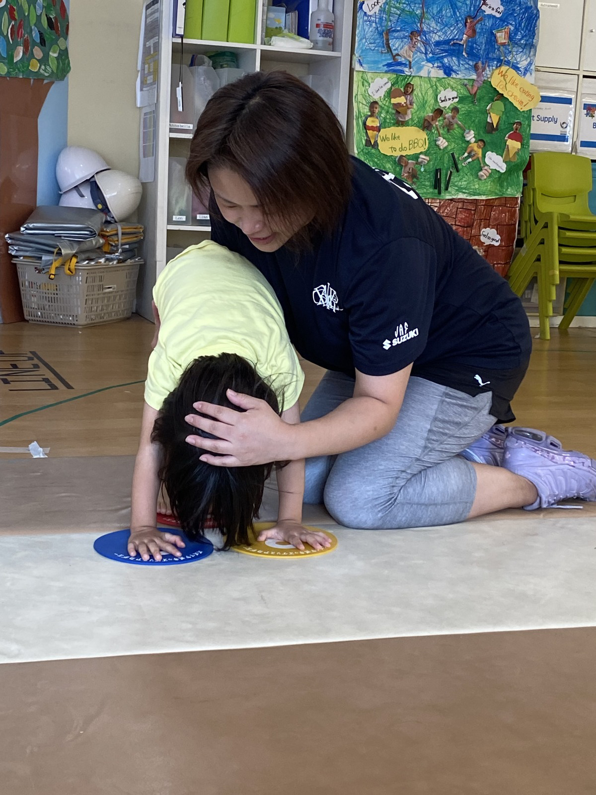 At this age, we introduce simple exercises to strengthen the arms, since many children nowadays find it hard to put their hands out when they fall. Running, jumping with both feet, and trying playful forward rolls (“kururinpa”) with teachers all help children naturally develop core strength and climbing ability—while having lots of fun turning their bodies upside down.