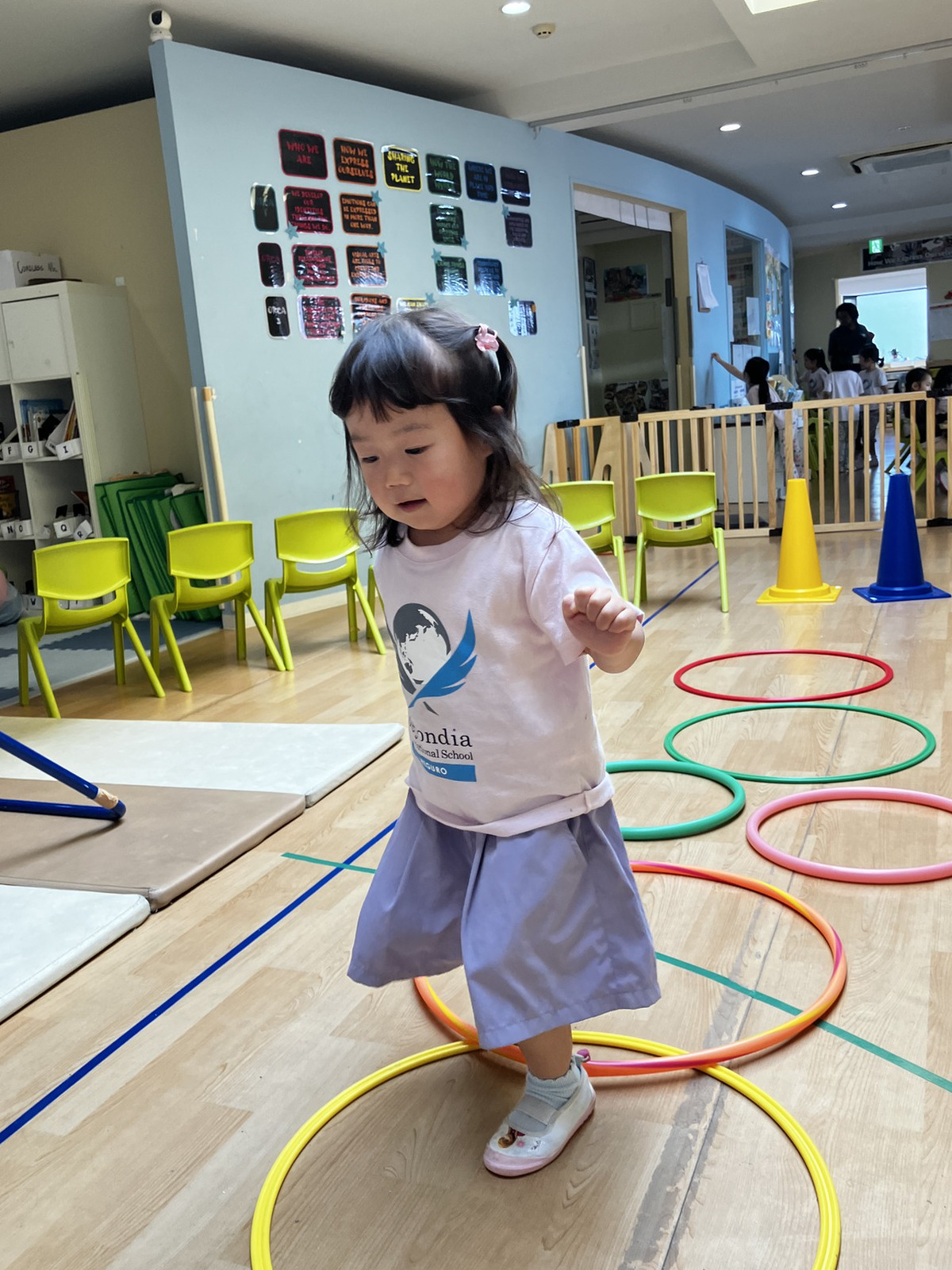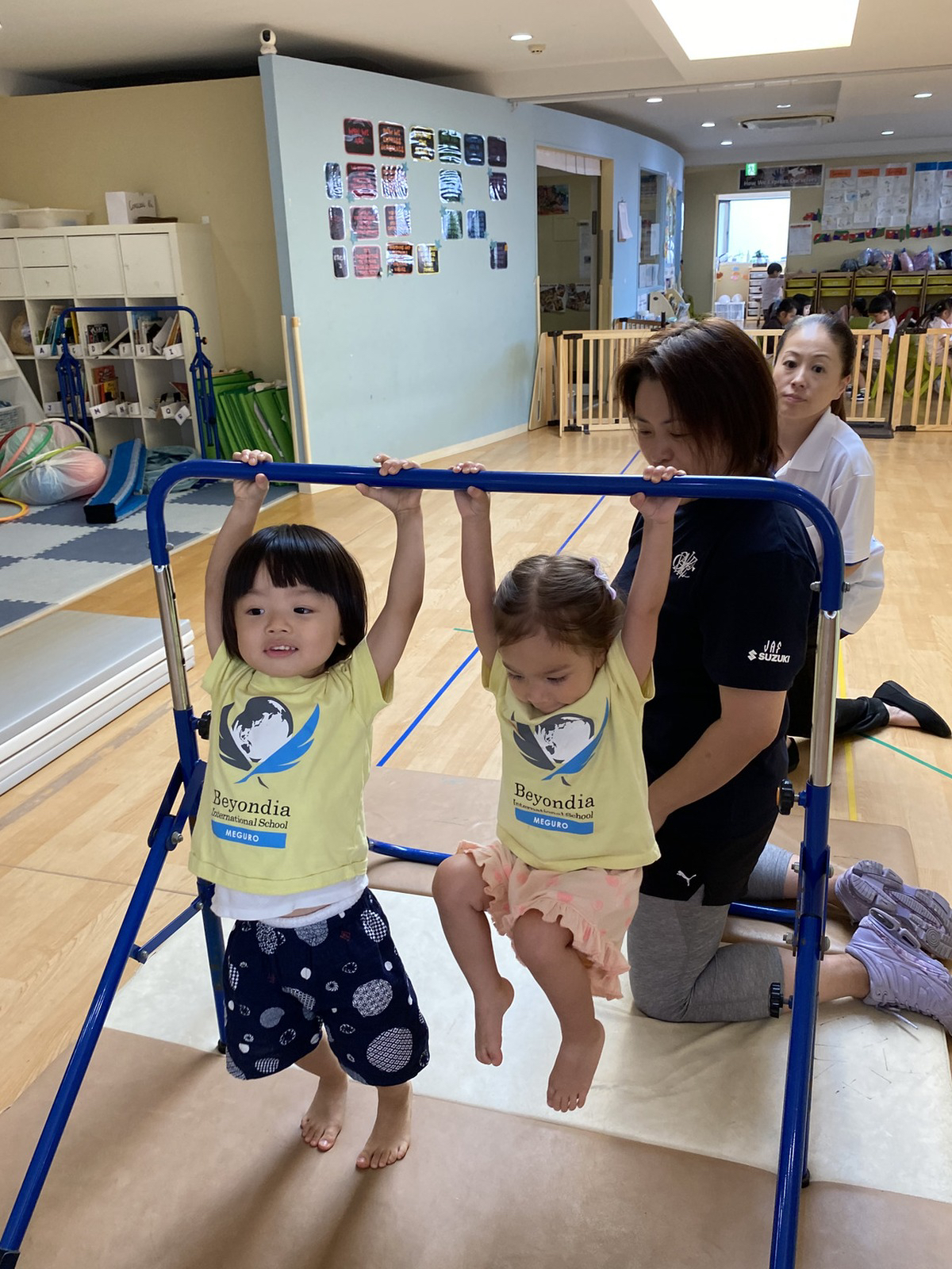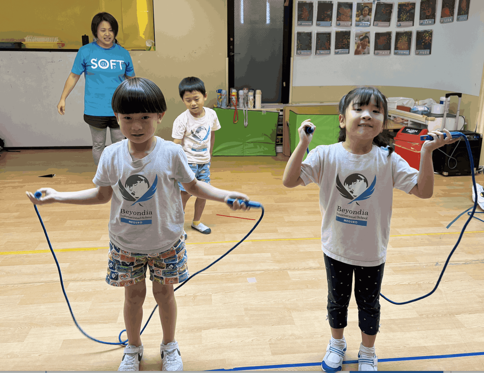 At Beyondia Meguro, our PE lessons are led by a specialist teacher who helps children build the physical skills they need before starting elementary school. Through fun activities like bar exercises, jump rope, and mat work, we focus not only on developing strong, healthy bodies but also on nurturing a positive “I can do it!” spirit.